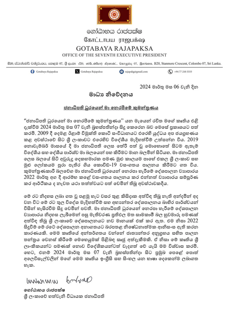 “ජනපති ධුරයෙන් මා නෙරපීමේ කුමන්ත්රණය” නමින් හිටපු ජනාධිපති ගෝඨාභය රාජපක්ෂ මහතා විසින් කෘතියක් රචනා කර තිබෙනවා.
